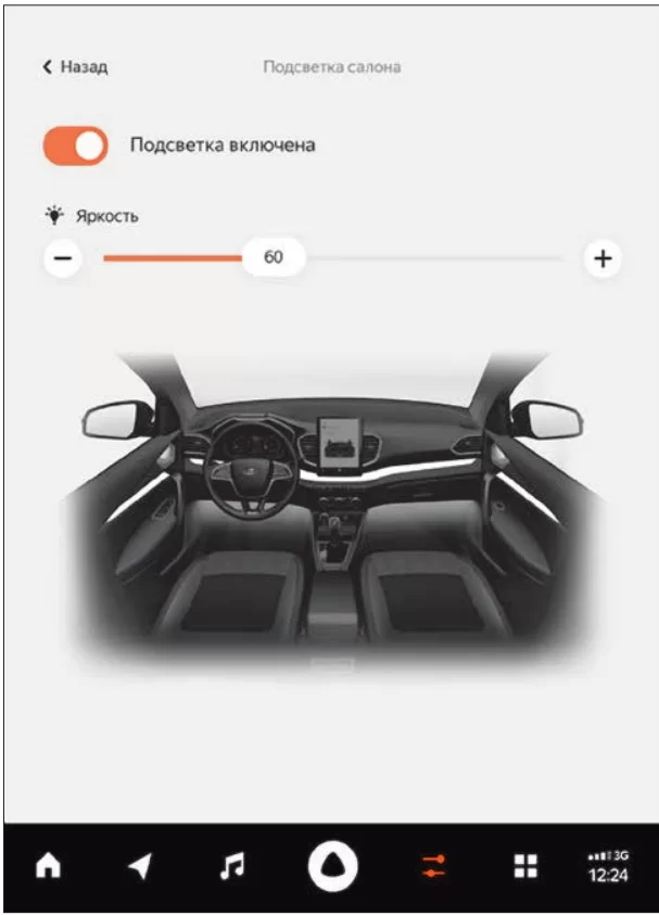 Подсветка салона. В этом разделе настроек можно включить/отключить атмосферную подсветку салона автомобиля, а также управлять ее яркостью. Атмосферная подсветка включается с максимальной яркостью при открытии дверей автомобиля или срабатывании системы бесключевого доступа. Отключение атмосферной подсветки происходит через 20 с момента закрытия дверей. После запуска двигателя яркость атмосферной подсветки включается на уровень, выставленный в окне настроек. После остановки двигателя атмосферная подсветка включается с максимальным уровнем яркости. Отключение атмосферной подсветки происходит через 20 с или при запирании автомобиля.