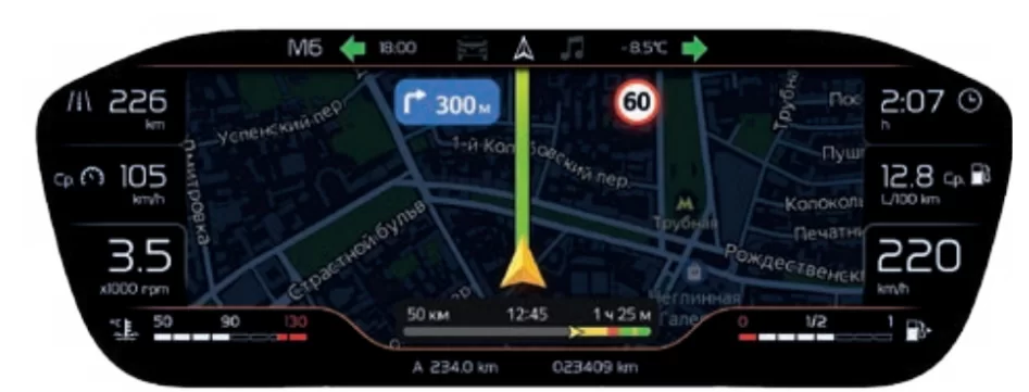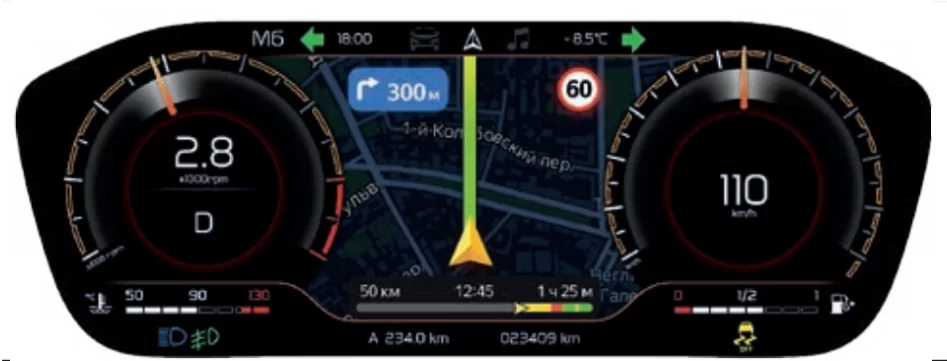 Цифровая комбинация приборов отображает информацию о состоянии автомобиля, навигационную информацию и информацию о медиа.