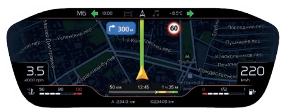 При активированной проекции Android Auto/Apple CarPlay подсказки отображаются в виде информационных карточек.При проложенном маршруте на приборной панели в данном режиме будет отображаться сам маршрут, подсказка с расстоянием до ближайшего поворота, ограничение скорости на участке дороги, расчетное время прибытия и ситуация на дороге.