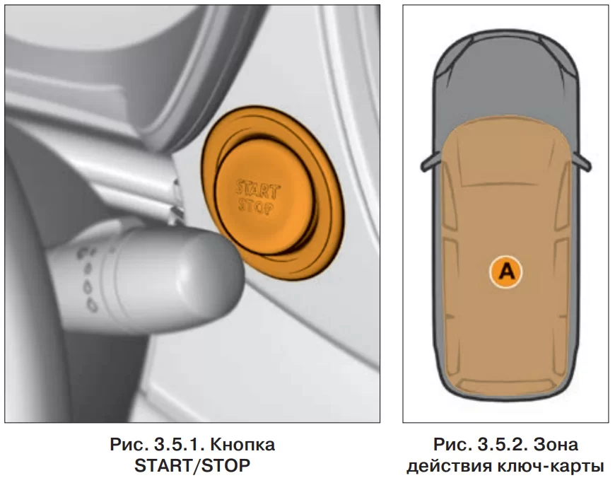Для включения зажигания и пуска двигателя ключ-карта должна находиться в зоне действия А (рис. 3.5.2) – в салоне автомобиля. Пуск двигателя возможен только при наличии ключ-карты.