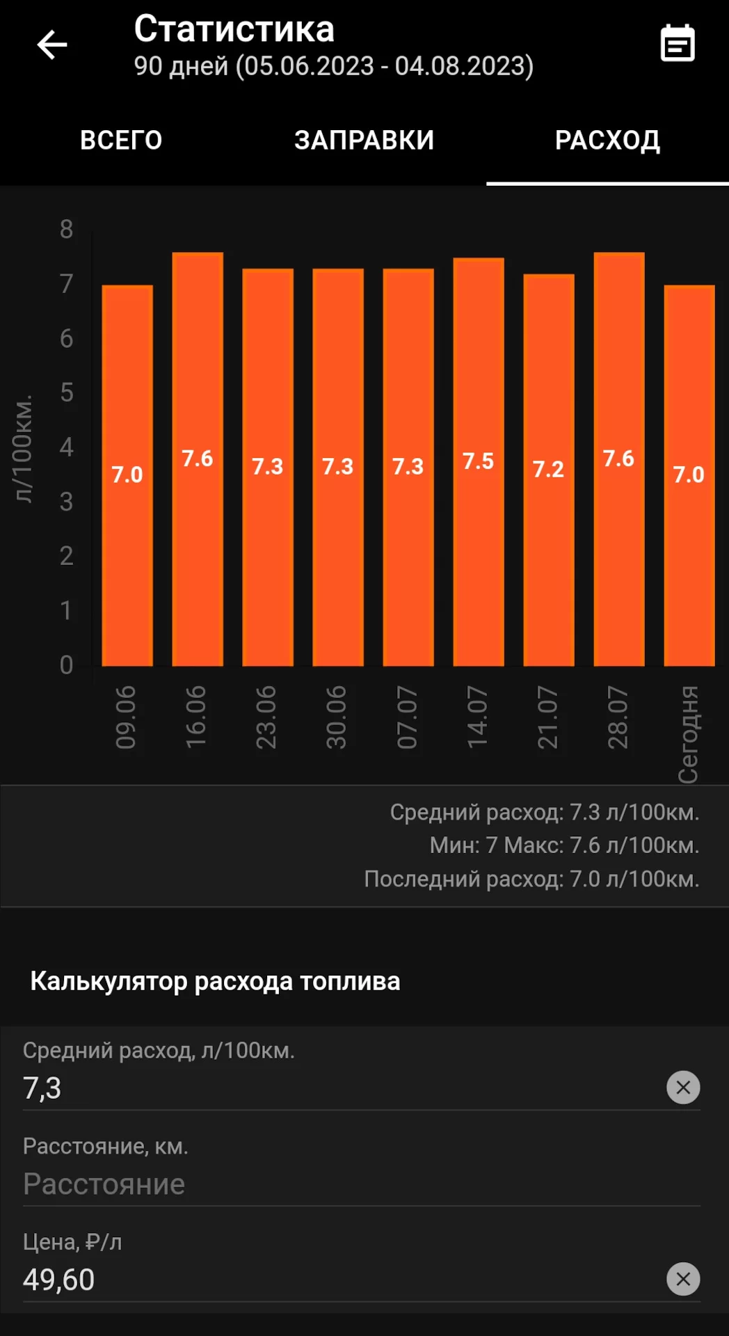 Итого за два летних месяца средний расход топлива вышел 7.3 л/100км.