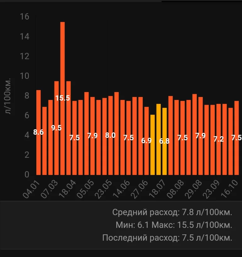 Также gromozeka поделился отчетом по расходу топлива за 10 месяцев эксплуатации. Средний расход составил 7.8 л/100км (90% трасса, 3 человека в салоне + барахло ~ 270кг).