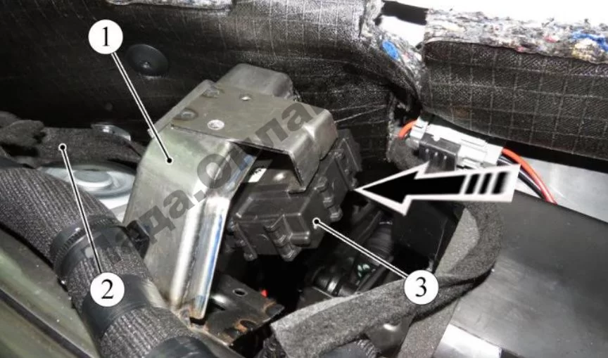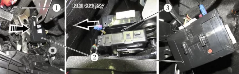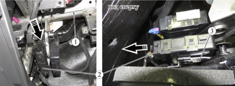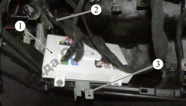 Рисунок 10-9 – Извлечение электронного блока uBCM: 1 – блок (uBCM); 2 – жгут проводов панели приборов; 3 – кронштейн блока uBCM