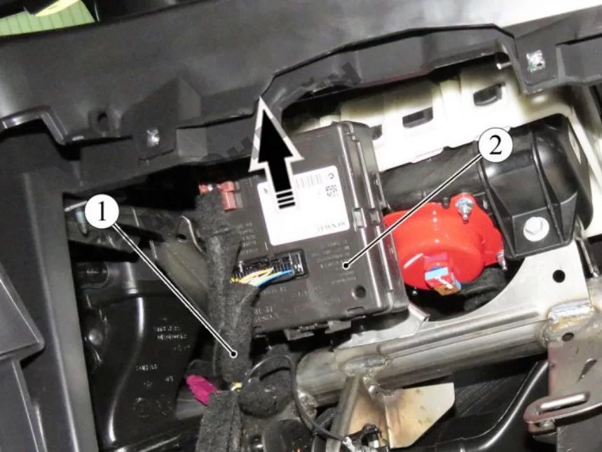 Рисунок 10-2 – Снятие блока HFM: 1 – жгут проводов панели приборов 2 – блок (модуль) бесключевого доступа (HFM)