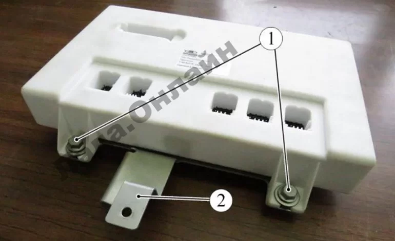 Рисунок 10-10 – Снятие блока uBCM:с кронштейна 1 – болт крепления блока uBCM к кронштейну; 2 – кронштейн блока uBCM