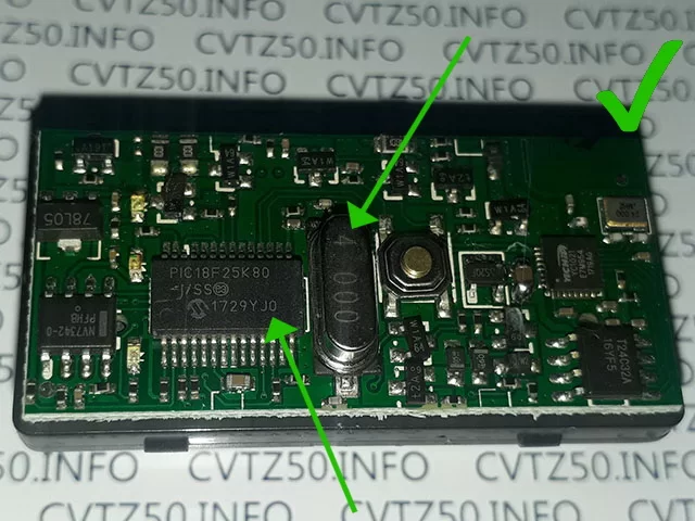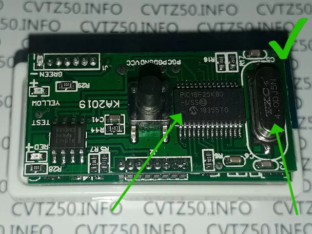 - Недалеко от чипа находится кварцевый генератор с указанной частотой 16.000MHz; настоящий PIC18F25K80 работает с генератором на 4.000MHz. Однако этот признак не является гарантией того что чип настоящий.