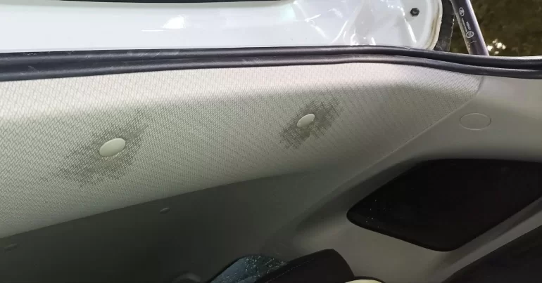 Вода сочится через клипсы в центре обивки потолка.