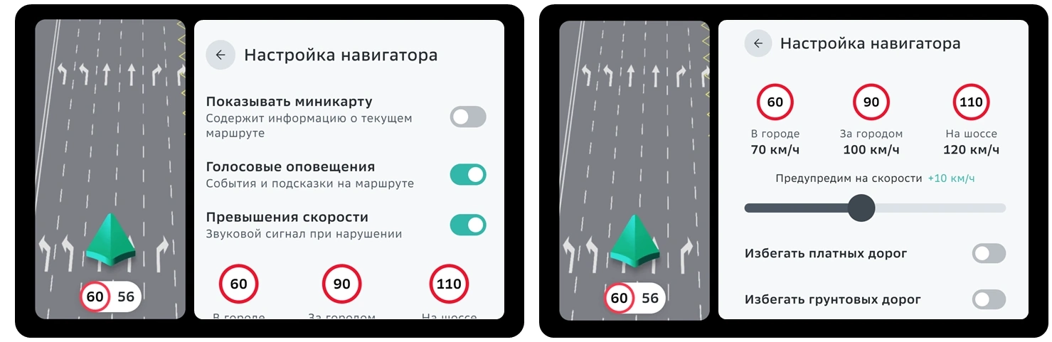 На странице настроек навигатора отображаются следующие настройки. Для просмотра настроек, расположенных ниже, необходимо смахнуть вверх.