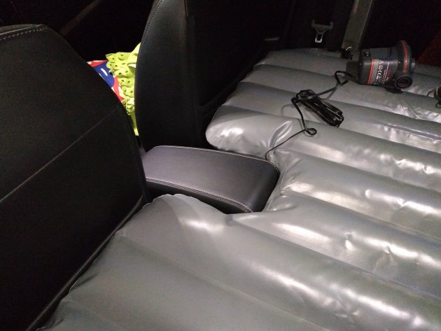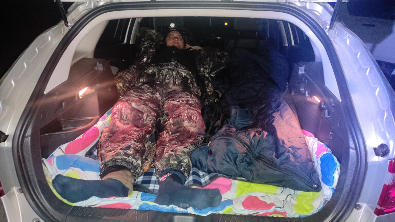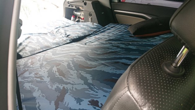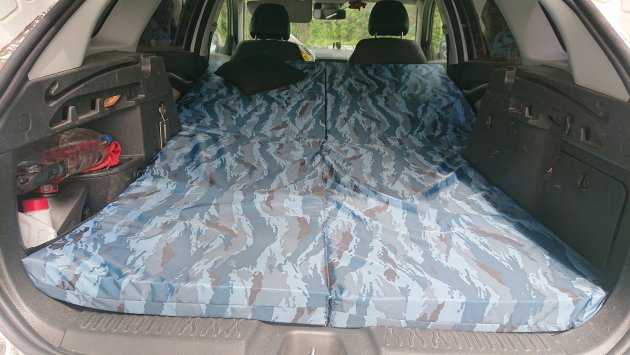 Так как сидушки формованы, то мы закладывали углубления всякими вещами, и поверх всего этого стелили спальник, другим укрывались. Еще одна важная деталь, с которая доставила дискомфорт в первую ночь, это то, что задняя сидушка приподнята относительно багажника на пару см, что мы в следующий вечер оптимизнули при помощи третьего спальника (видно на фото), и стало прям комфортно.