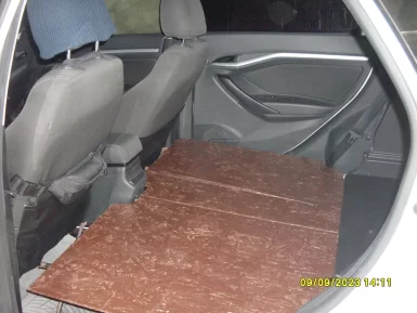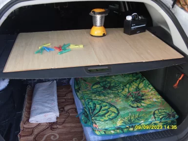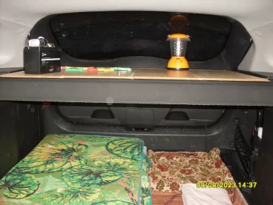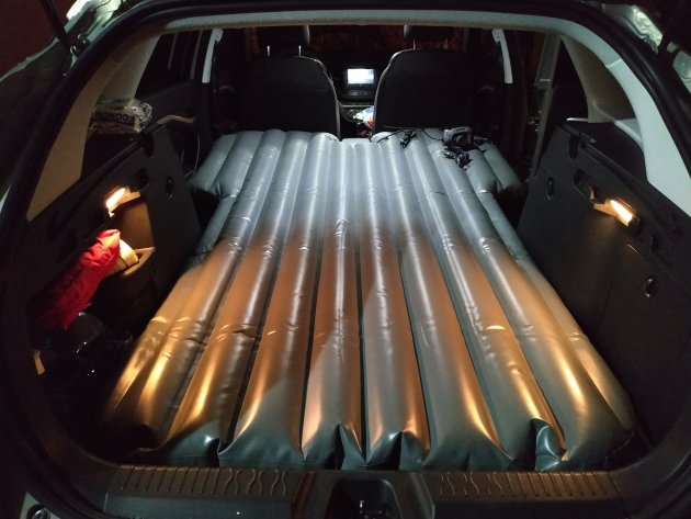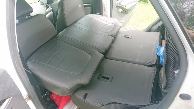 Завалил спинку заднего дивана, сдвинул передние сиденья на максимум вперёд, повесил доп площадку и вуаля, почти как дома в кровати, мой рост 183, ещё куча места. Реально, ночёвка в SW)