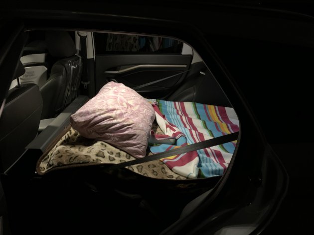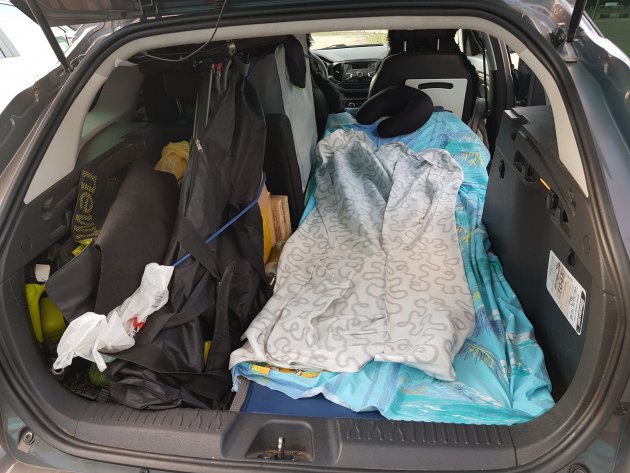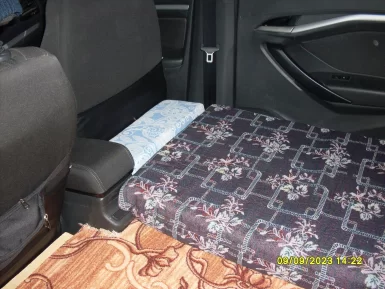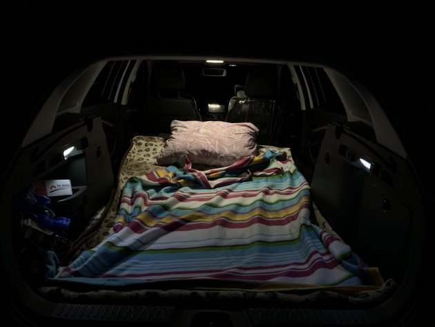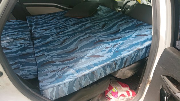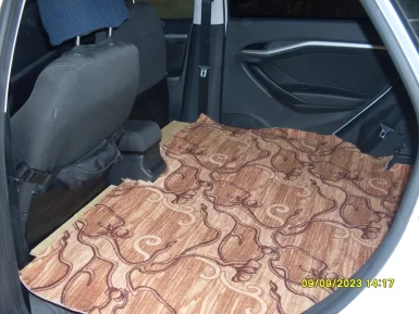 Вместо матраца мы положили 2 одеяла. Спим ногами в багажник, так как там тесновато. Сидения подвинули вперёд и в полный рост можно без проблем поместиться.