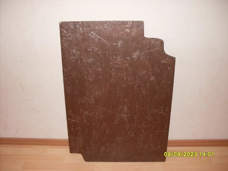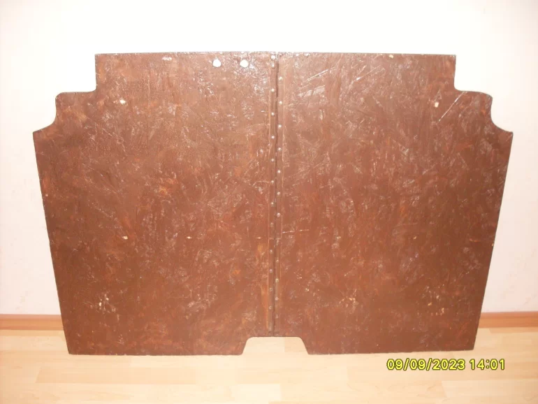 Сначала она была цельная, потом её он распилил пополам и соединил рояльной петлёй на саморезах. Покрасил тем что было. Деталька в сложенном виде умещается в багажнике, когда надо ехать в пятером.