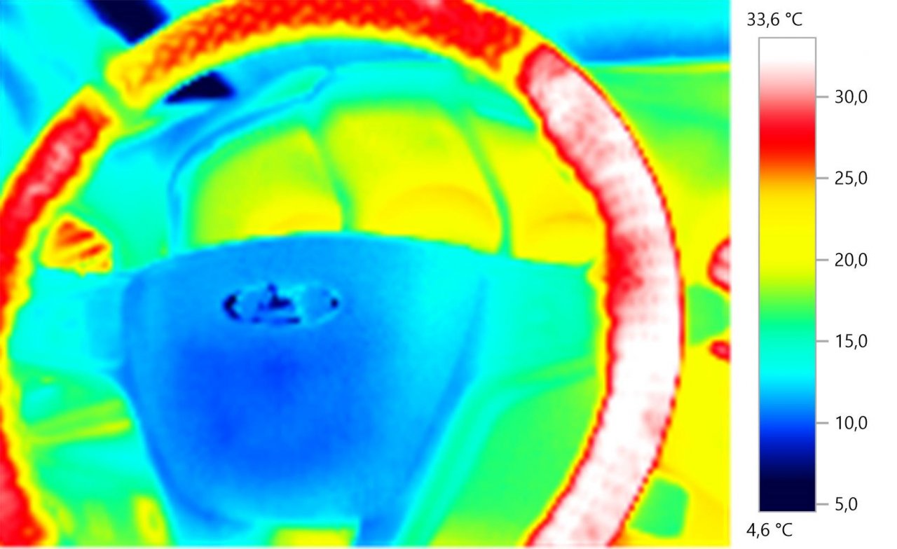 В распоряжении владельца Lada XRAY Cross в комплектации LUXE PRESTIGE оказался тепловизор. По снимкам можно заметить, как располагаются нити обогрева рулевого колеса. Справа нагрев больше.