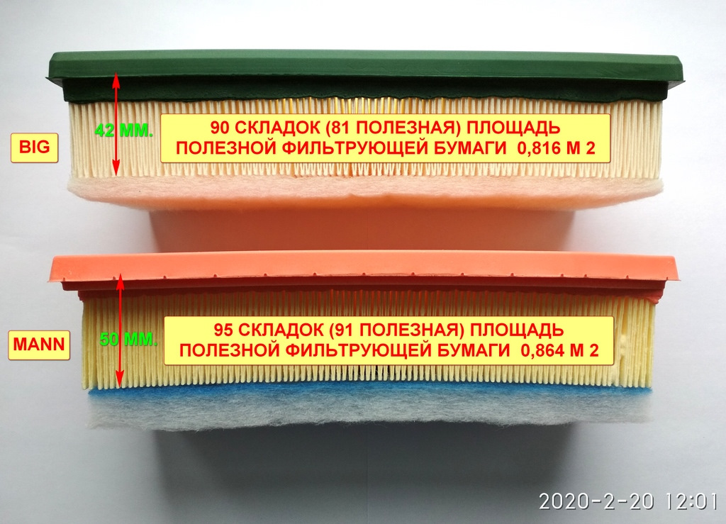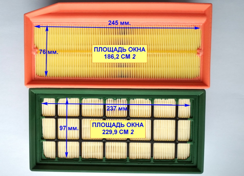 Сравнение воздушных фильтров старого и нового образца (разная площать фильтрации):