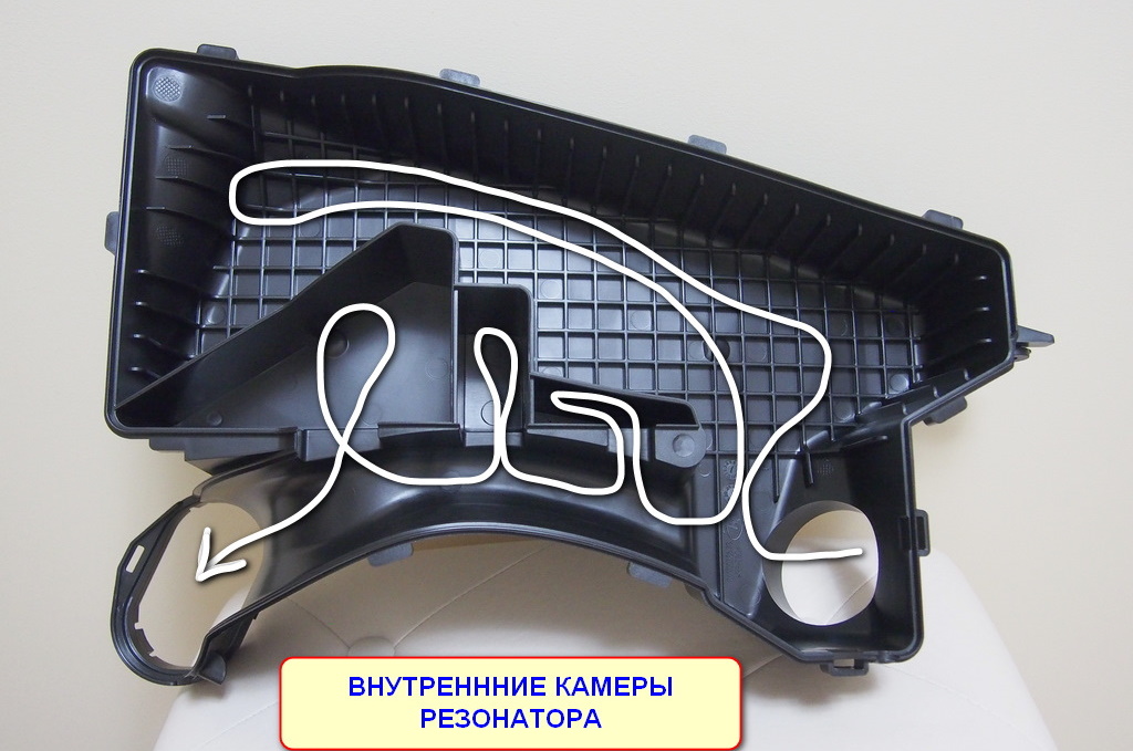 Вместе с этим завод перекроил и резонатор. Сравнив два резонатора (старого и нового образца) было выявлено, что защёлки на патрубке резонатора н/о, что фиксируют резонатор в корпусе фильтра, достаточно толстые и жёсткие. Защёлкивание в корпусе происходит основательно, но вытащить резонатор н/о из корпуса обратно сложно. Нижняя защёлка, как самая узкая, просто надламывается у своего основания, т.к. ей не хватает эластичности.