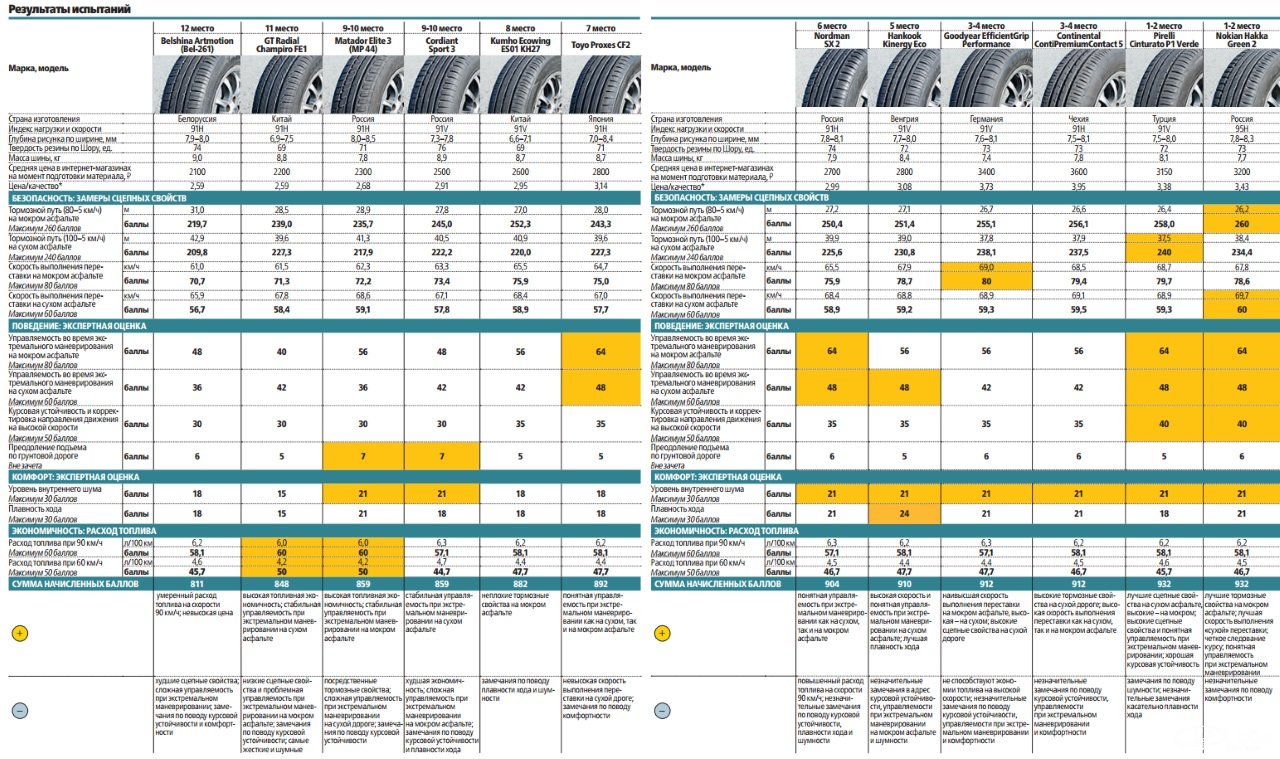 Популярное интернет-издание проводило сравнительный тест 11 типов шин (10 разных марок), результаты которого опубликовали в 2016 году. На основании ряда испытаний был составлен рейтинг шин: