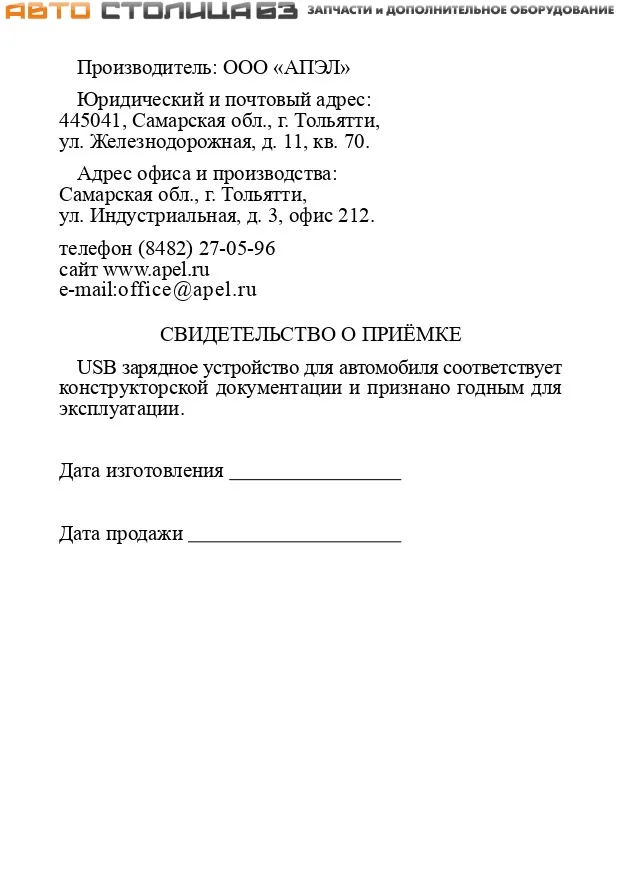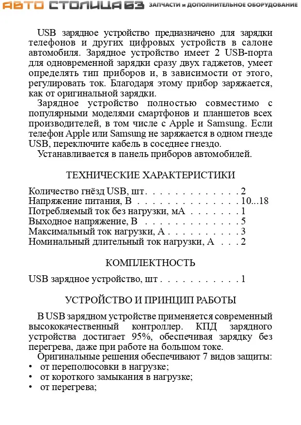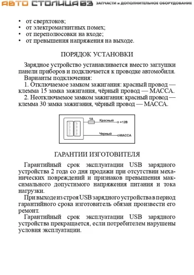 USB зарядное устройство для автомобиля. Инструкция (PDF, 206.6Kb)