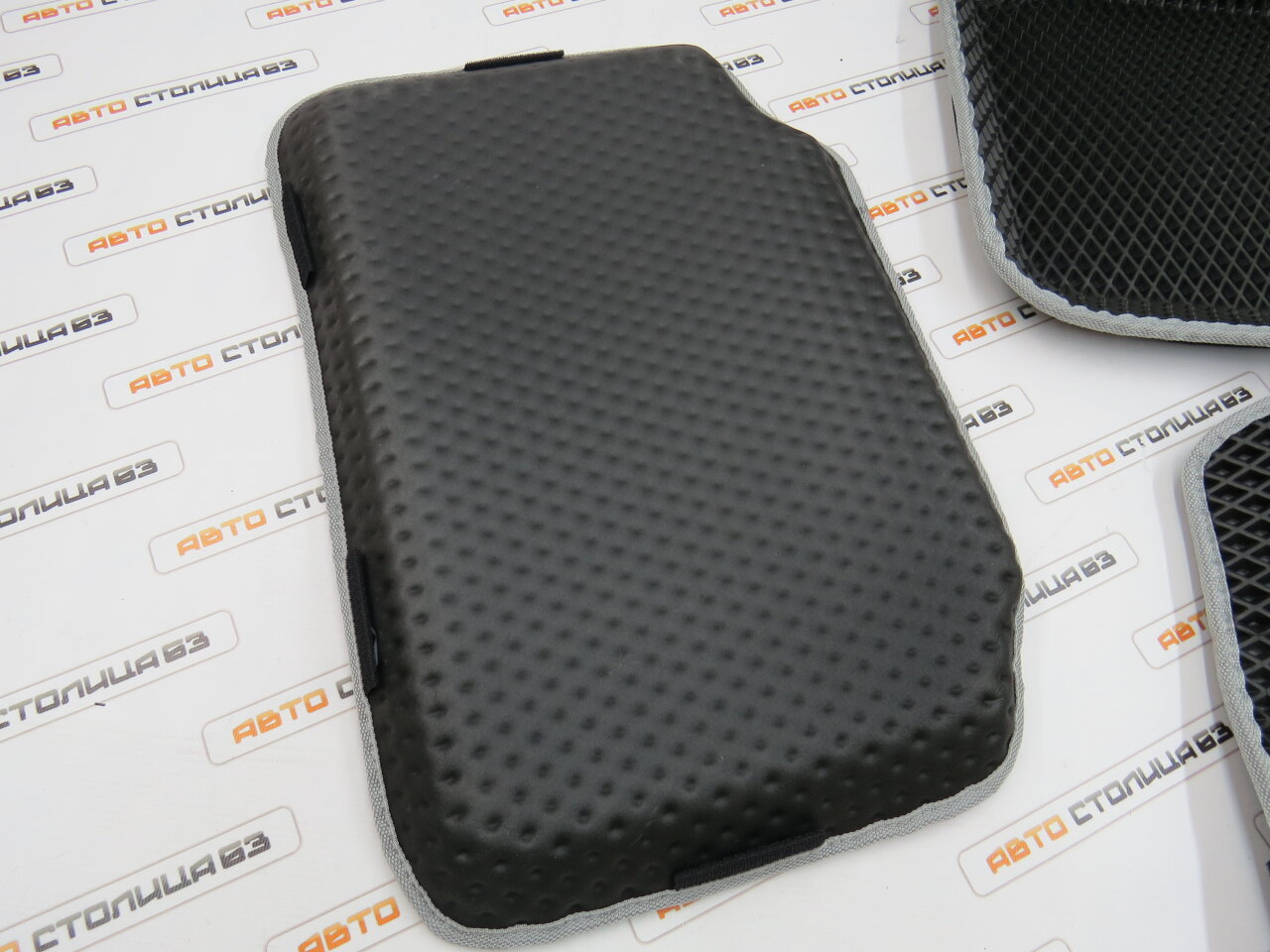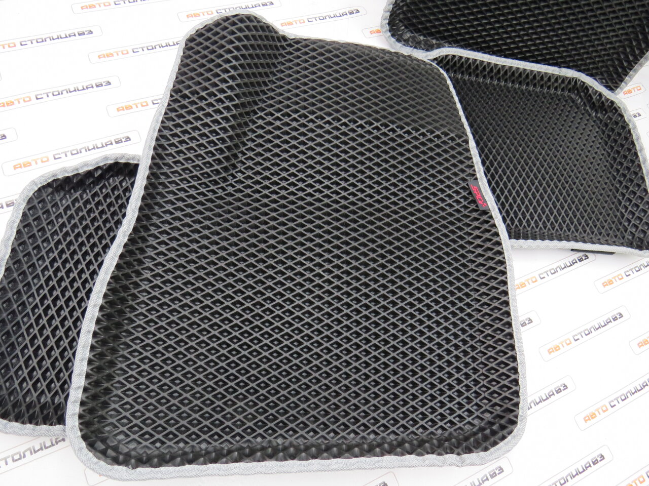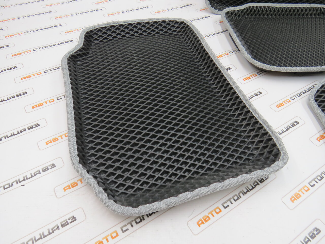 Комплект ковриков салона для автомобиля Лада Нива из материала ЭВА (этилвинилацетат), цвет материала ковров - черный, цвет окантовки - серый.