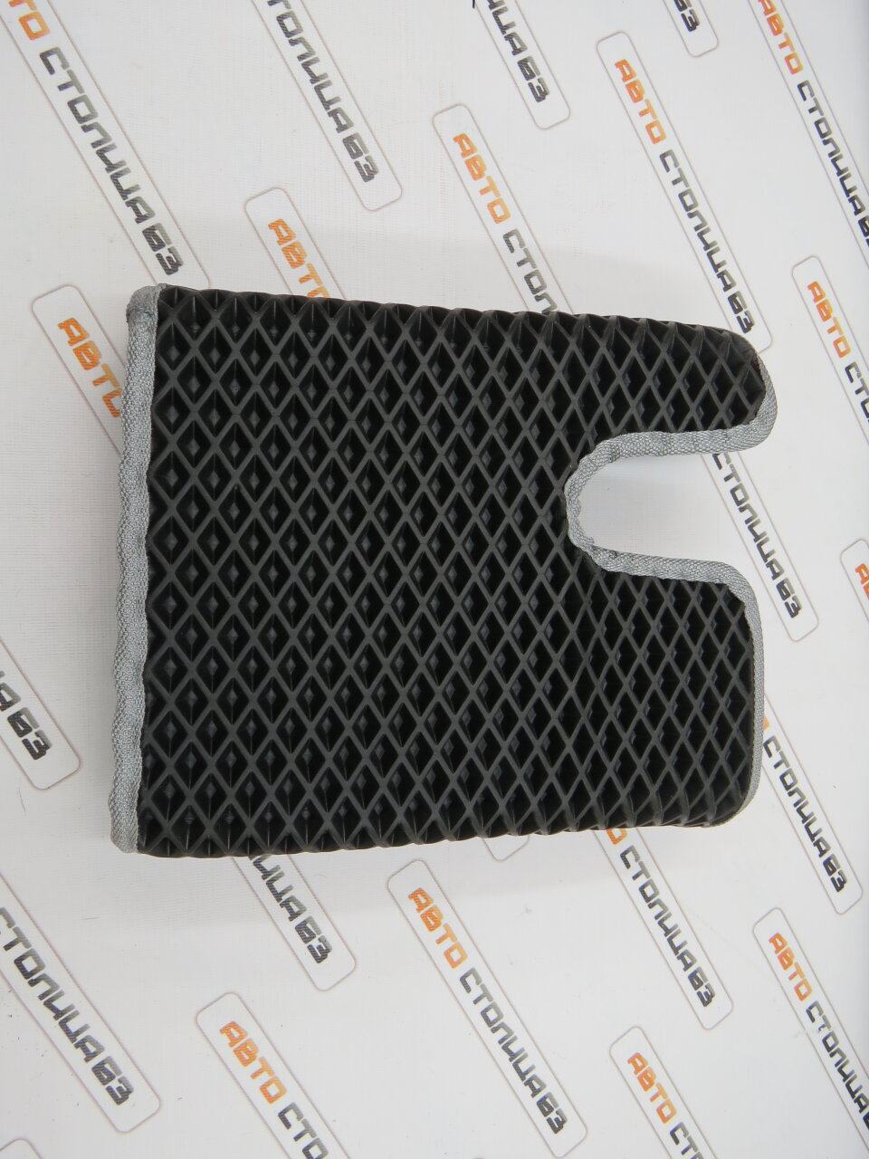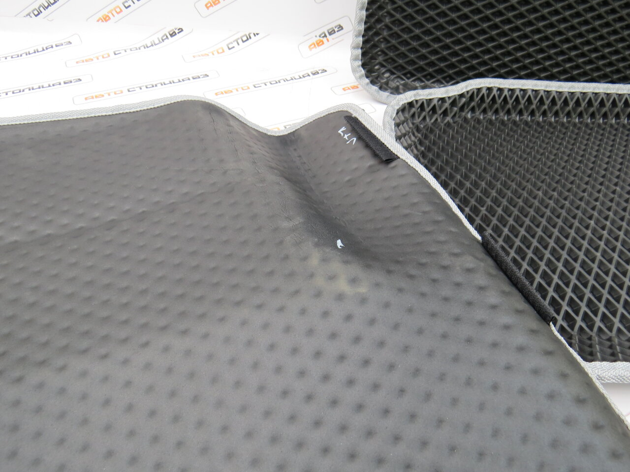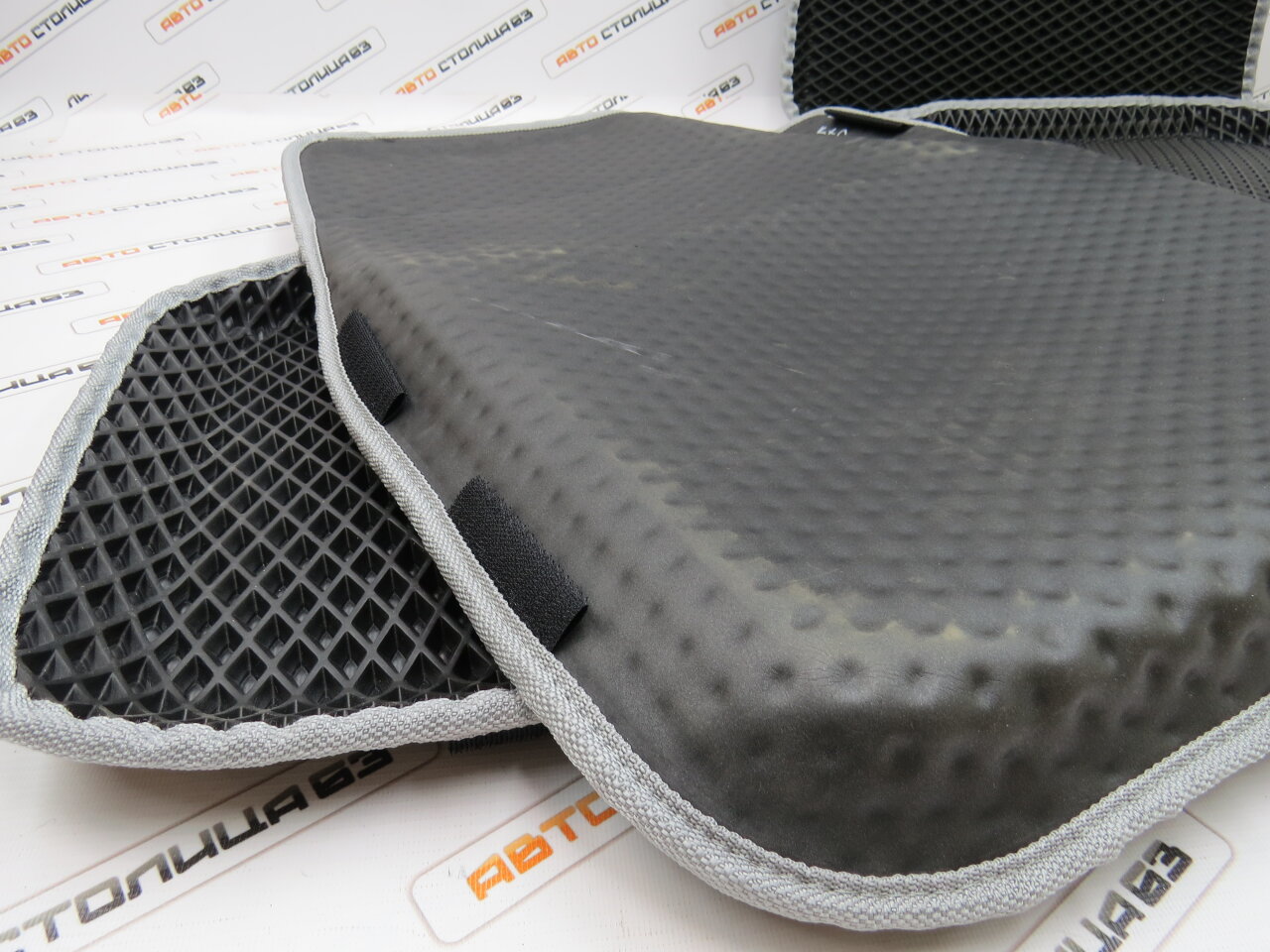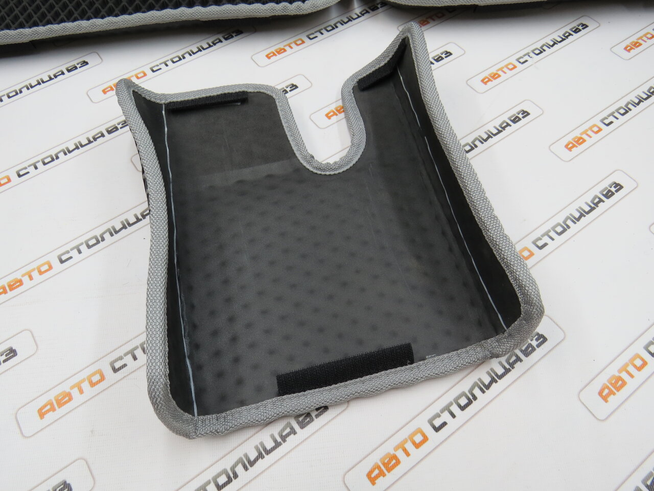 Комплект ковриков салона для автомобиля Лада Нива из материала ЭВА (этилвинилацетат), цвет материала ковров - черный, цвет окантовки - серый.