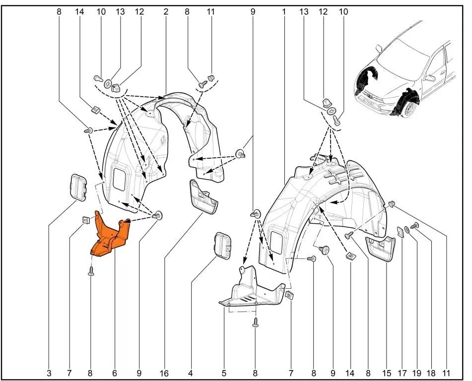 Штатный экран правого подкрылка для Лада Гранта FL.