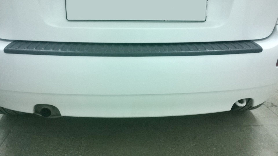 Защита верхней части заднего бампера автомобиля от царапин и сколов при погрузке и выгрузке. Установка производится через штатные болты крепления бампера на двухстороннюю ленту 3М (она уже нанесена на накладку).