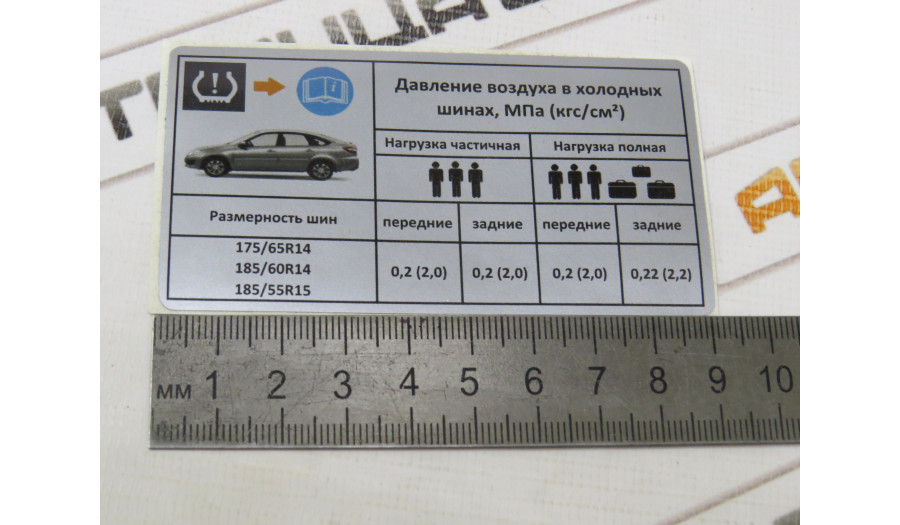 Информационная наклейка для автомобиля Лада Гранта в кузове Лифтбек с указанием размера применяемых шин и допустимого давления в шинах.