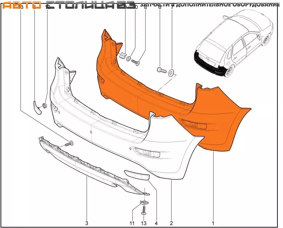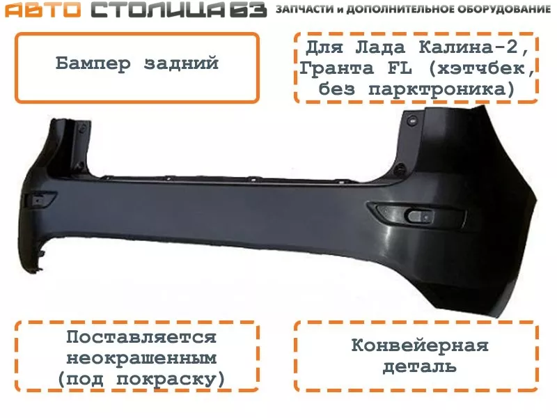Оригинальный заводской задний бампер для автомобилей Лада Калина-2 (хэтчбек) и Гранта FL (хэтчбек). Бампер не имеет отверстий для парктроника.