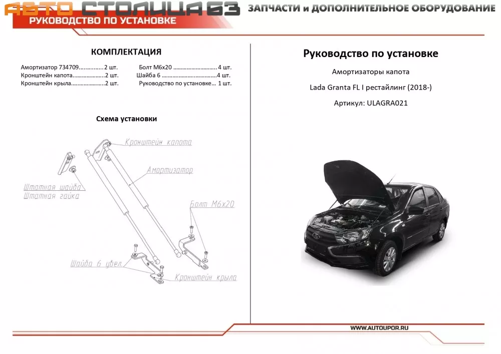 Упоры капота АвтоУпор ULAGRA021 для автомобиля Лада Гранта FL с 2018 года. Амортизаторы капота значительно упрощают процесс открывания капота, благодаря функции автоматического подъема и фиксации крышки. Угол открытия индивидуален для заданной модели автомобиля.