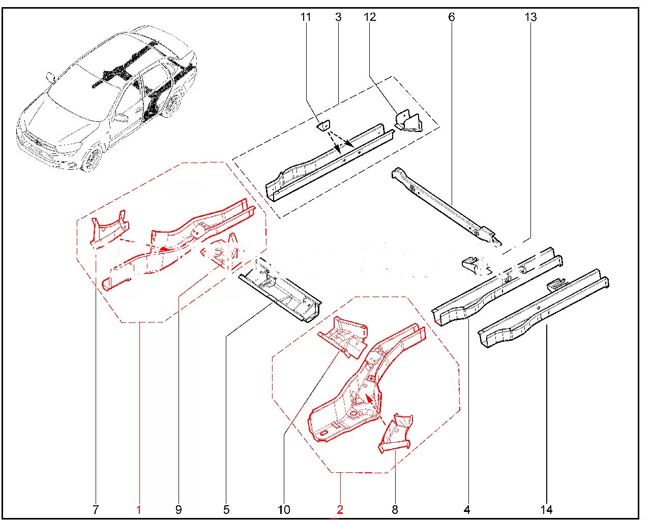Штатный оригинальный лонжерон пола средний в сборе (катафорез) для Lada Granta, Kalina-2.