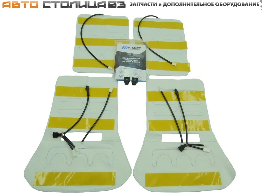 В комплект входят нагревательные элементы подушки и спинки сиденья (по 2 штуки) со жгутами проводки, кнопки включения обогрева (2 штуки, с белой подсветкой), проводка для монтажа обогрева сидений.
