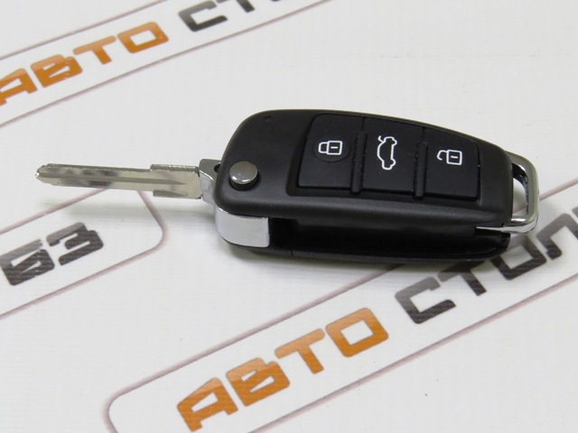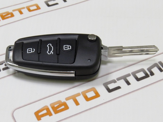 Выкидной ключ выполнен на манер «Audi». Брелок содержит кнопки для управления штатной (заводской) сигнализацией - открытие/закрытие дверей, багажника.