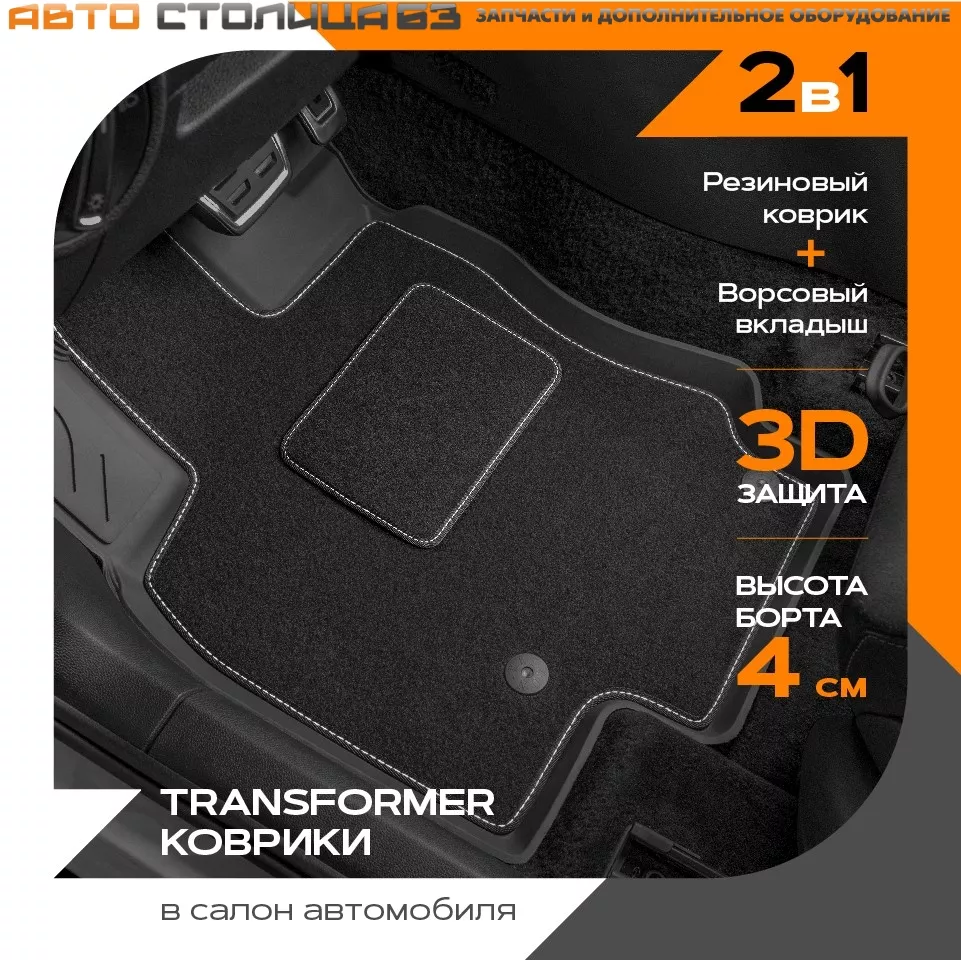 Коврики Трансформер сочетают в себе преимущества двух ковриков в одном комплекте - резиновый ковер, который имеет ворсовый вкладыш на фирменных пластиковых кнопках. При изготовлении ковров используется высококачественное полипропиленовое волокно и эластичная водонепроницаемая вторичная основа.