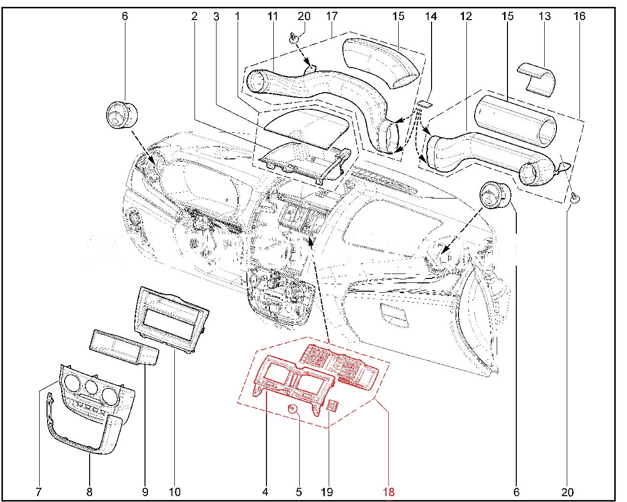 Оригинальная штатная накладка панели приборов в сборе с соплами и отделкой "Жидкий хром" для Лада Гранта FL c 2018 года.