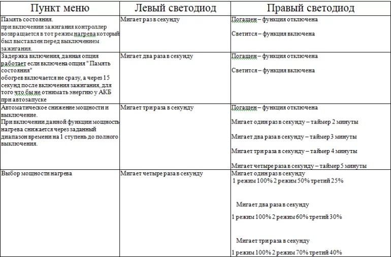 Контроллер позволяет реализовать 3-х уровневый подогрев передних сидений в автомобилях Лада Гранта и Калина-2, в которых отсутствует данная функция. Кнопки остаются штатные. Определить, какой включен режим подогрева можно по работе индикатора (100% - светодиод горит постоянно, 50% - светодиод изредка моргает, минимальный режим - светодиод быстро моргает)
