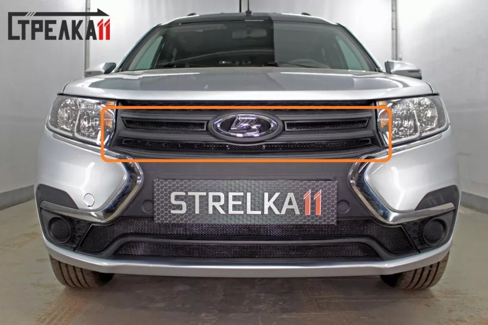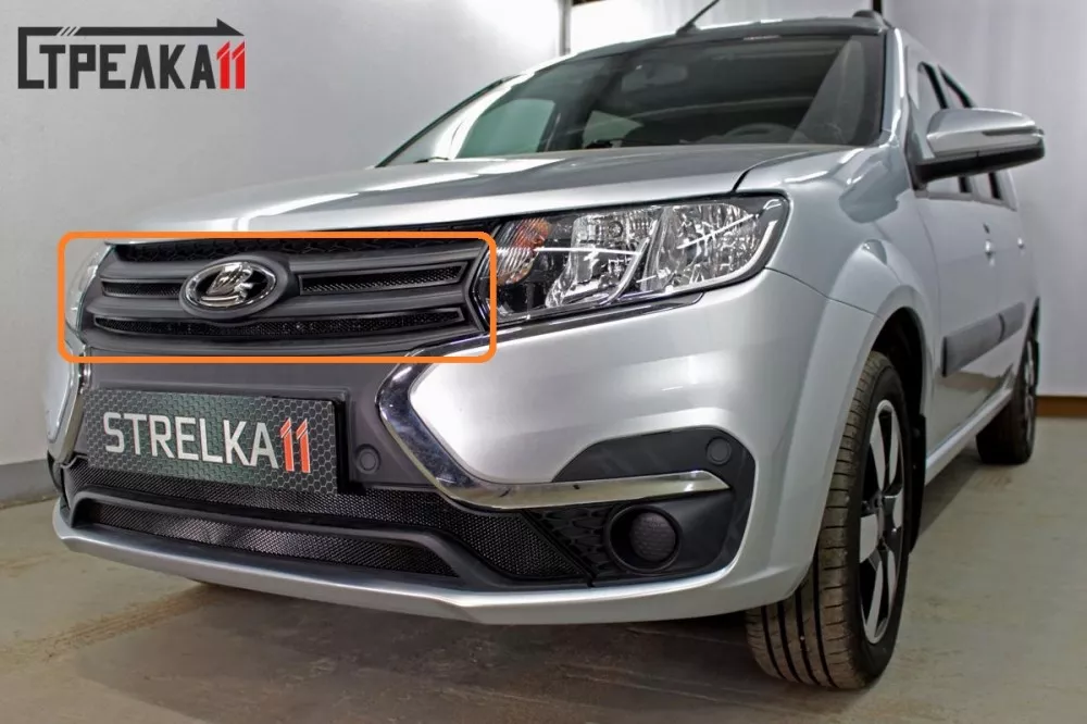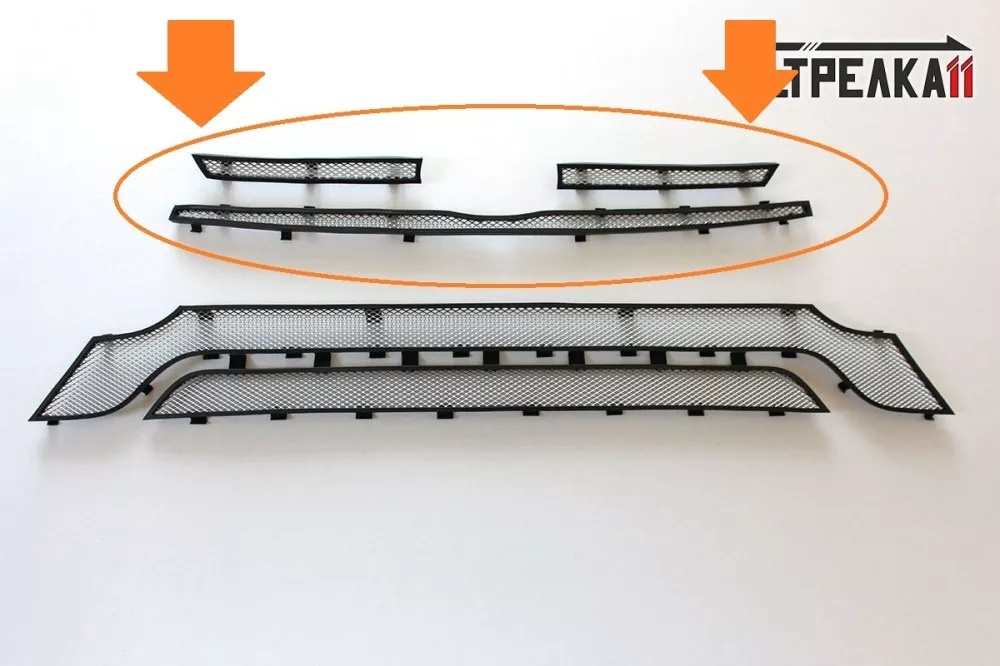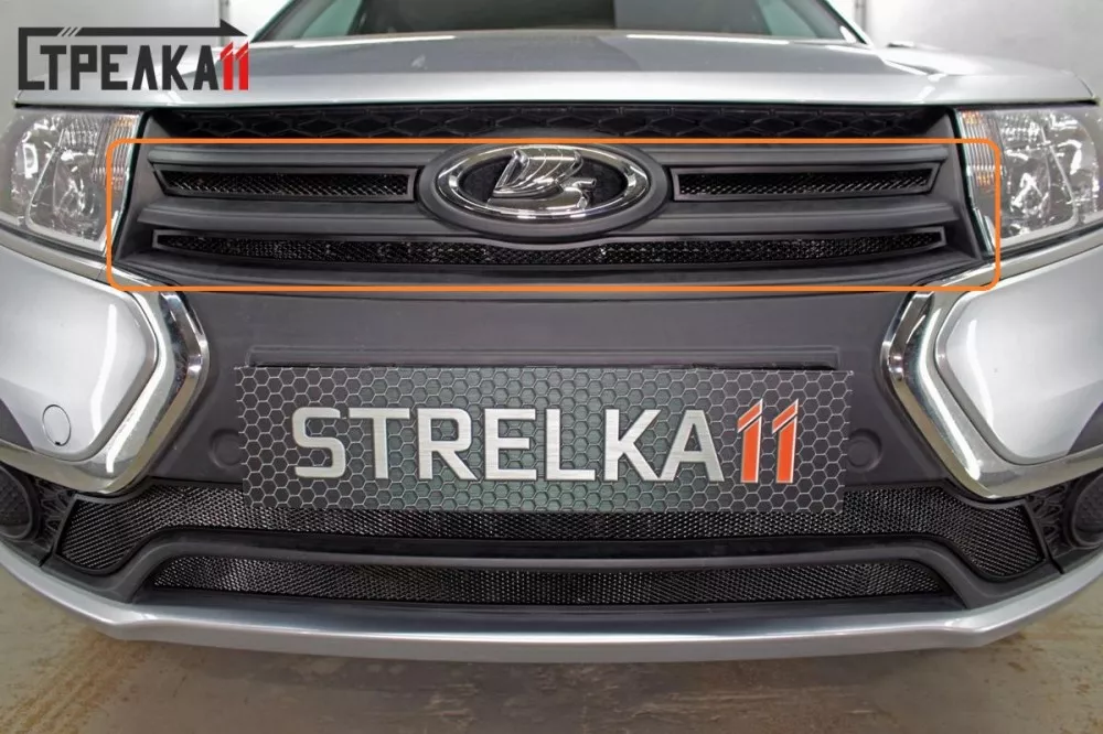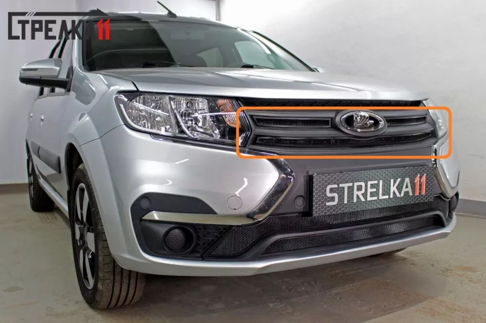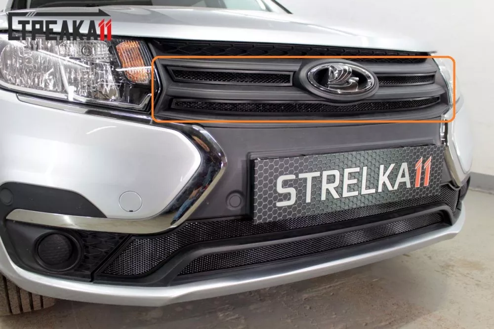 Защита радиатора Стрелка для Лада Ларгус FL с 2021 года (кроме Ларгус Кросс). В комплекте верхняя защита из 3 деталей, которые устанавливаются над номерным знаком. Цвет черный.