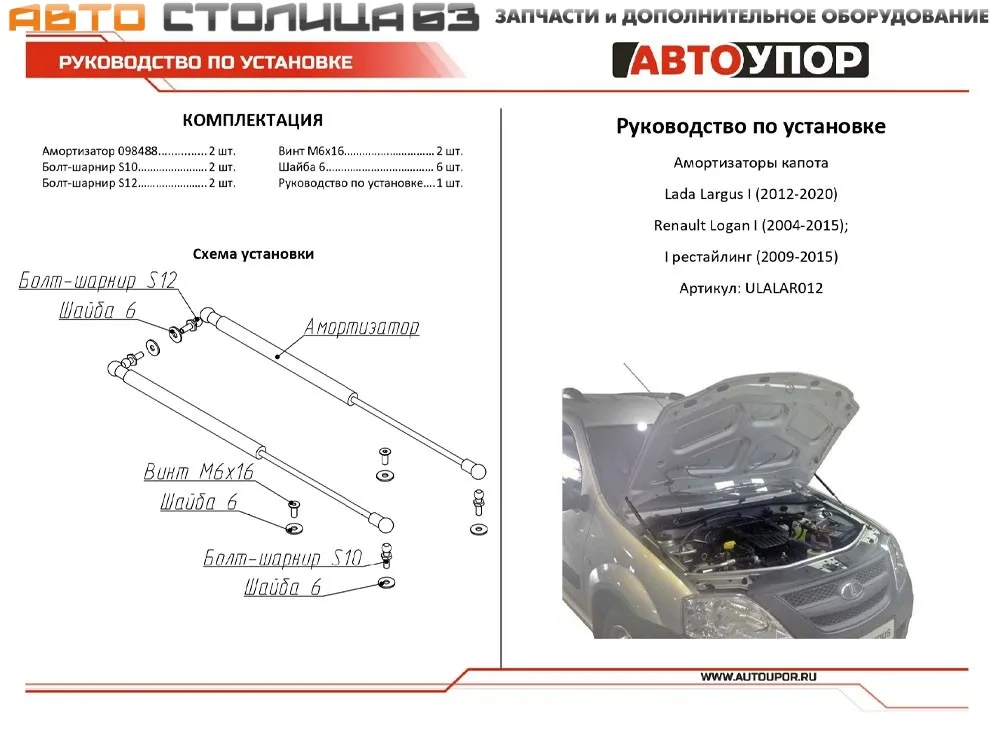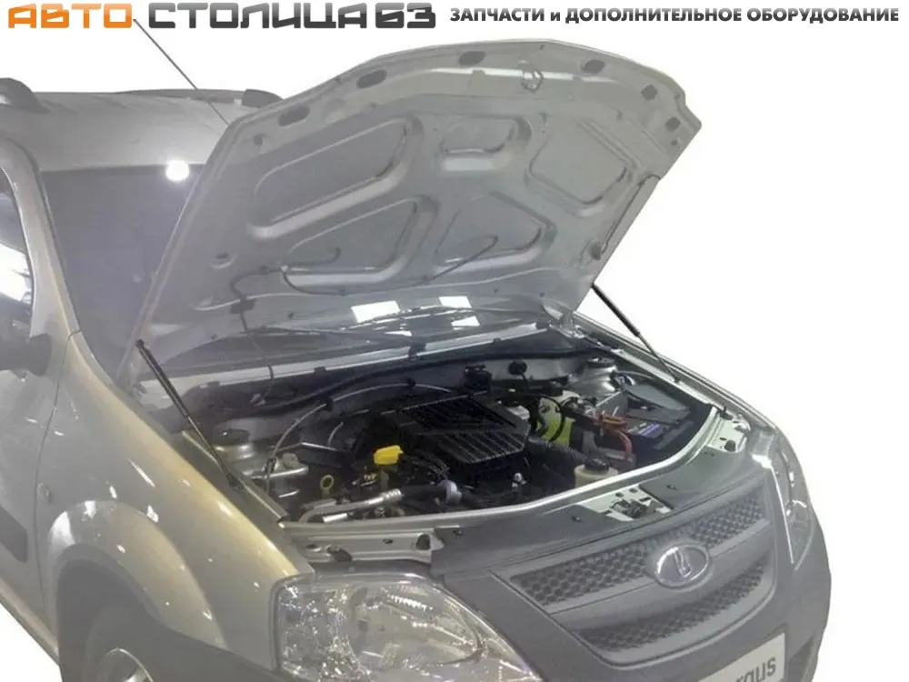 Упоры капота АвтоУпор для автомобиля Лада Ларгус (до 2020 года). Амортизаторы капота значительно упрощают процесс открывания капота, благодаря функции автоматического подъема и фиксации крышки. Угол открытия индивидуален для заданной модели автомобиля.