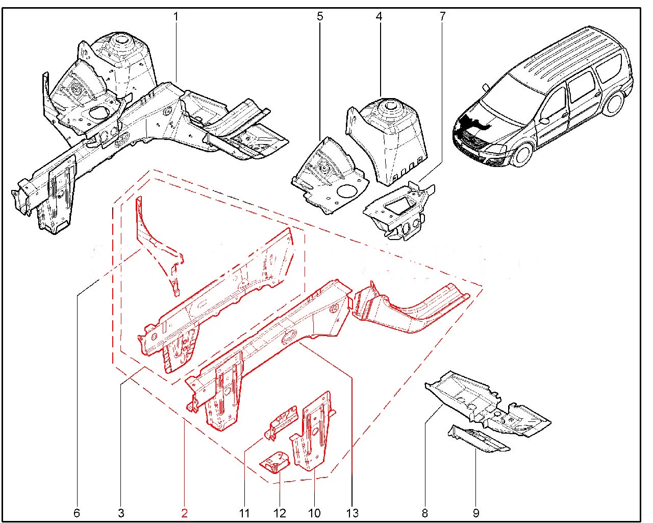 Штатный лонжерон передний с боковой панелью правый (ДВС ВАЗ) для Лада Ларгус ФЛ.