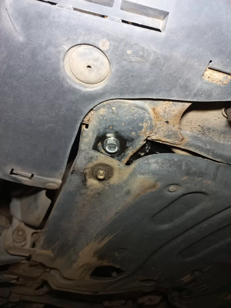 8. Одеваем защиту ДВС. Один болт оказывается под защитой, это не критично. Кто в душе "перфекционист", то болгарка в помощь, можно чуть защиту двигателя подпилить.