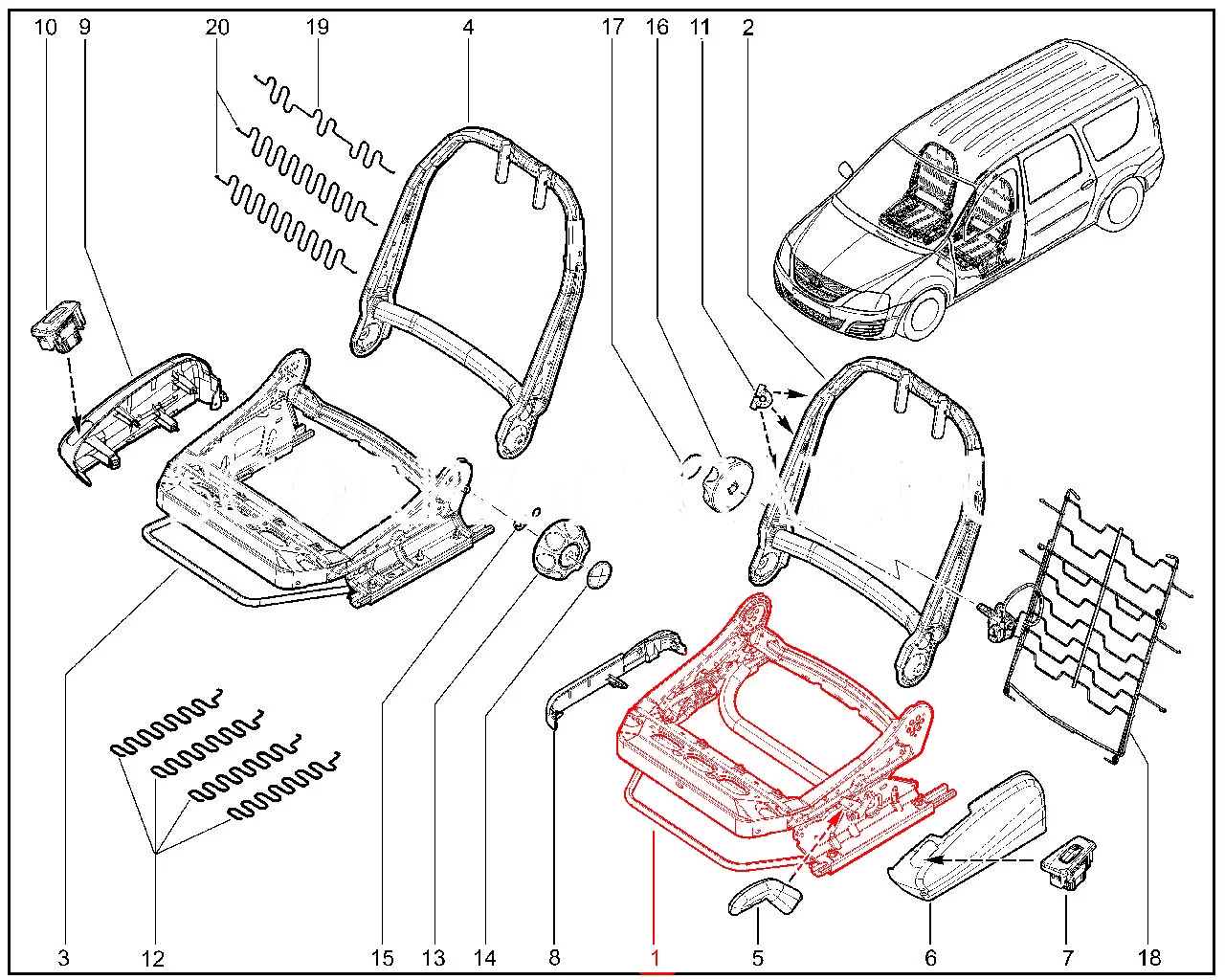 Штатный оригинальный каркас подушки левого сиденья c высотной регулировкой (с салазками в сборе) для Lada Largus.