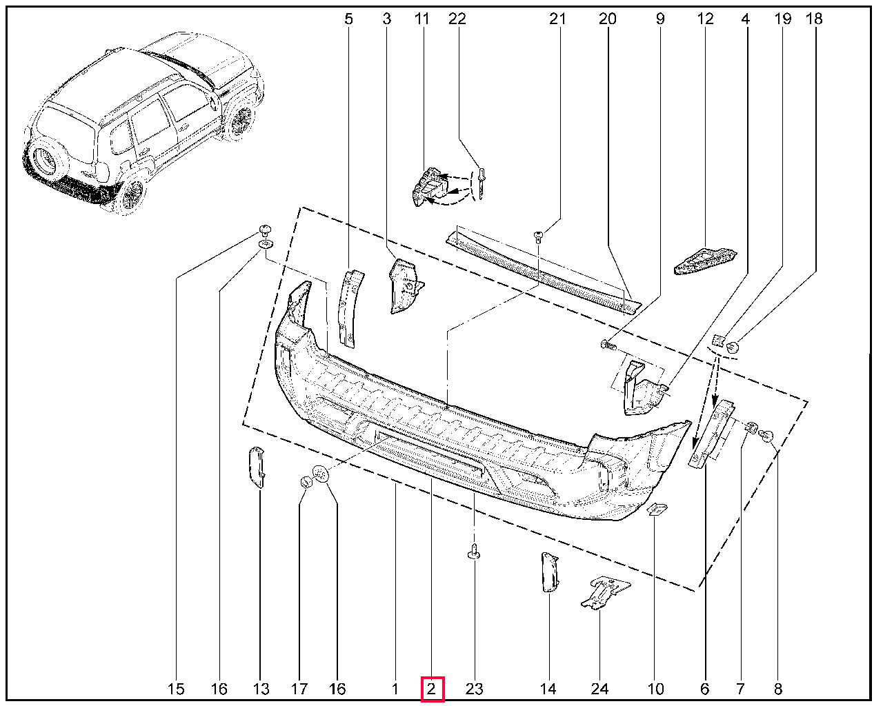Бампер задний Лада Нива Тревел (№2 на схеме).