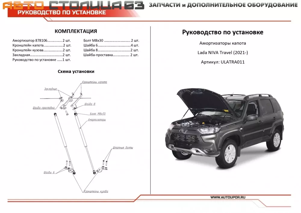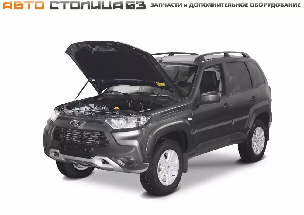 Упоры капота АвтоУпор ULATRA011 для автомобиля Нива Трэвел. Амортизаторы капота значительно упрощают процесс открывания капота, благодаря функции автоматического подъема и фиксации крышки. Угол открытия индивидуален для заданной модели автомобиля.
