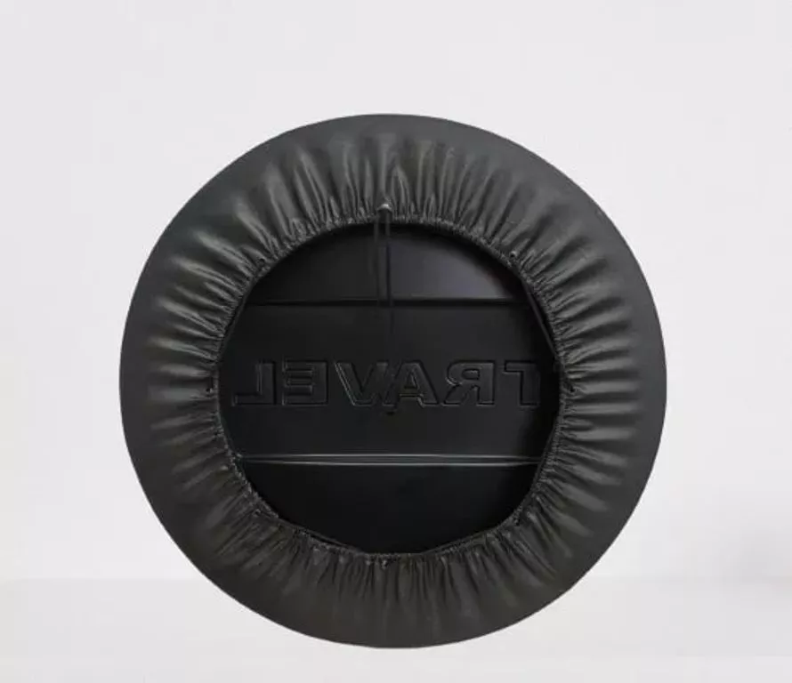 Колпак крепится на запасном колесе при помощи юбки из экокожи с фиксатором-резиной.