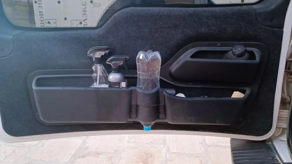 В кармане предусмотрено место для бутылки с водой, которую можно использовать как рукомойник, также выделили место для бачка омывателя, чтобы ничего не мешало его обслуживанию.