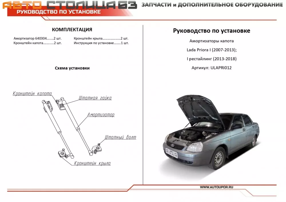 Упоры капота АвтоУпор ULAGRA021 для автомобиля Лада Лада Приора (все годы выпуска). Амортизаторы капота значительно упрощают процесс открывания капота, благодаря функции автоматического подъема и фиксации крышки. Угол открытия индивидуален для заданной модели автомобиля.