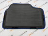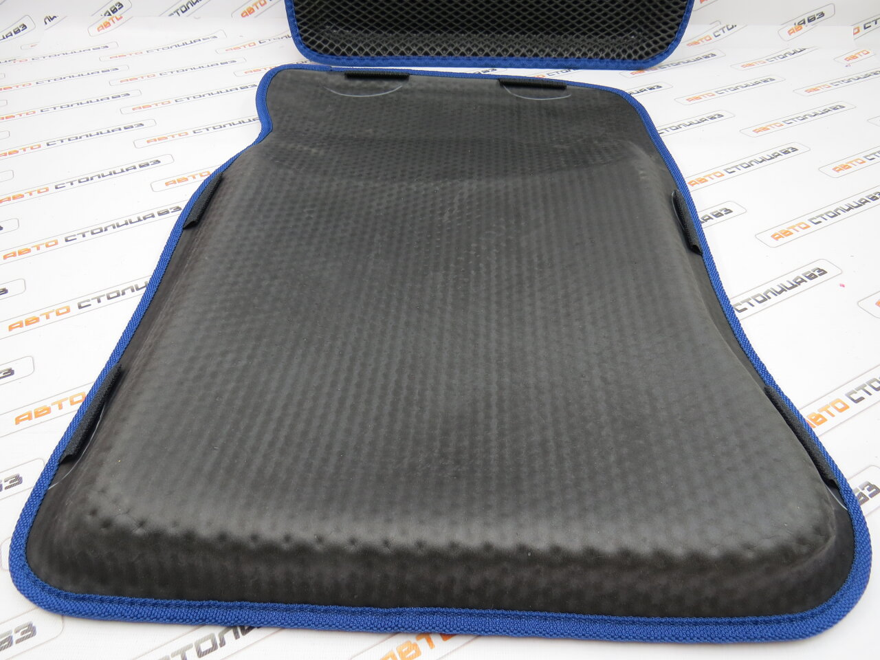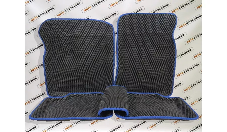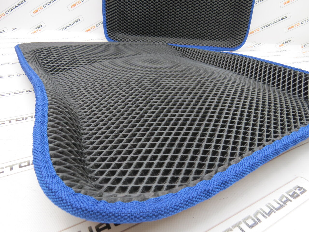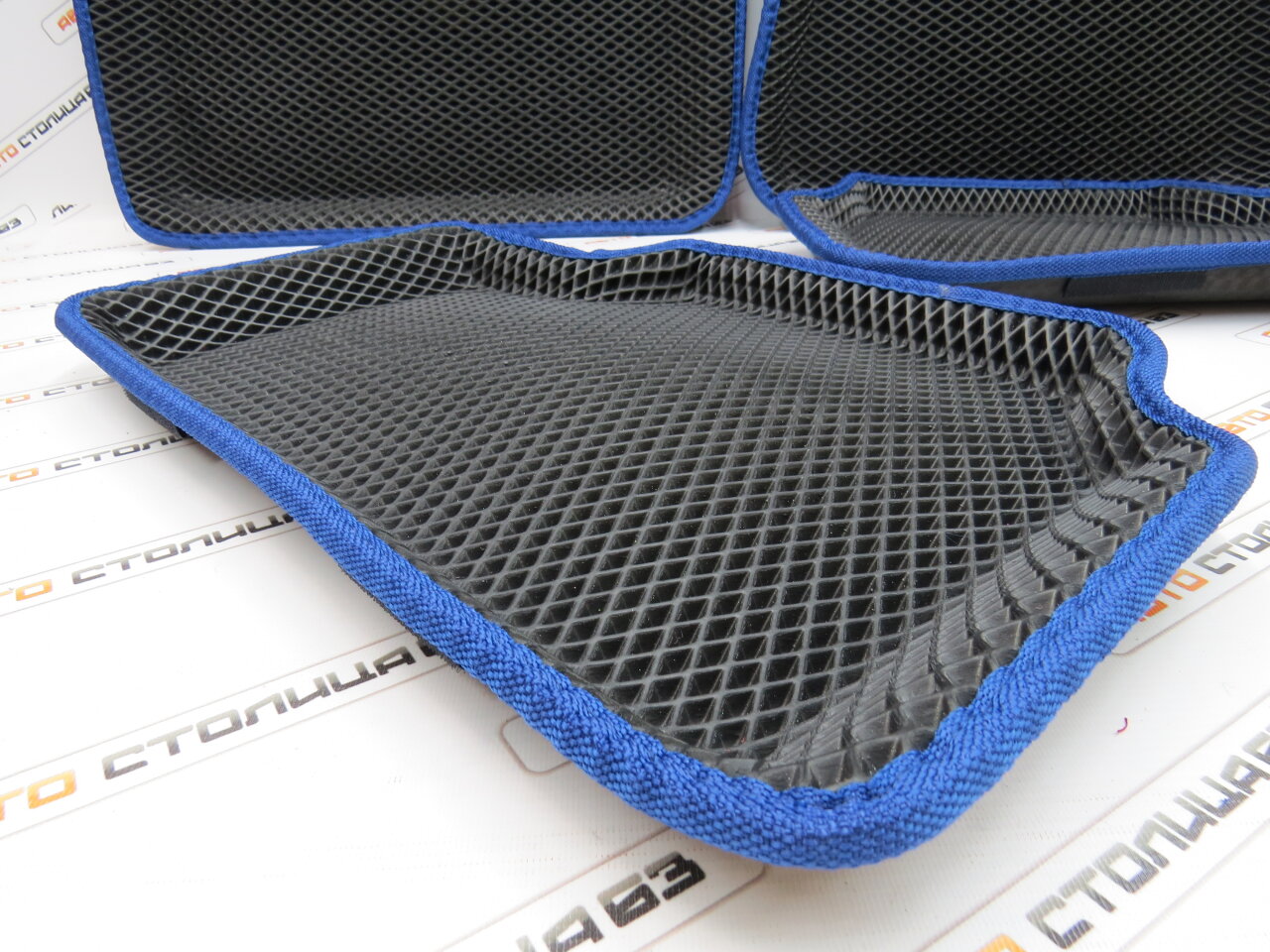 Комплект ковриков салона для автомобиля Лада Приора из материала ЭВА (этилвинилацетат), цвет материала ковров - черный, цвет окантовки - синий.