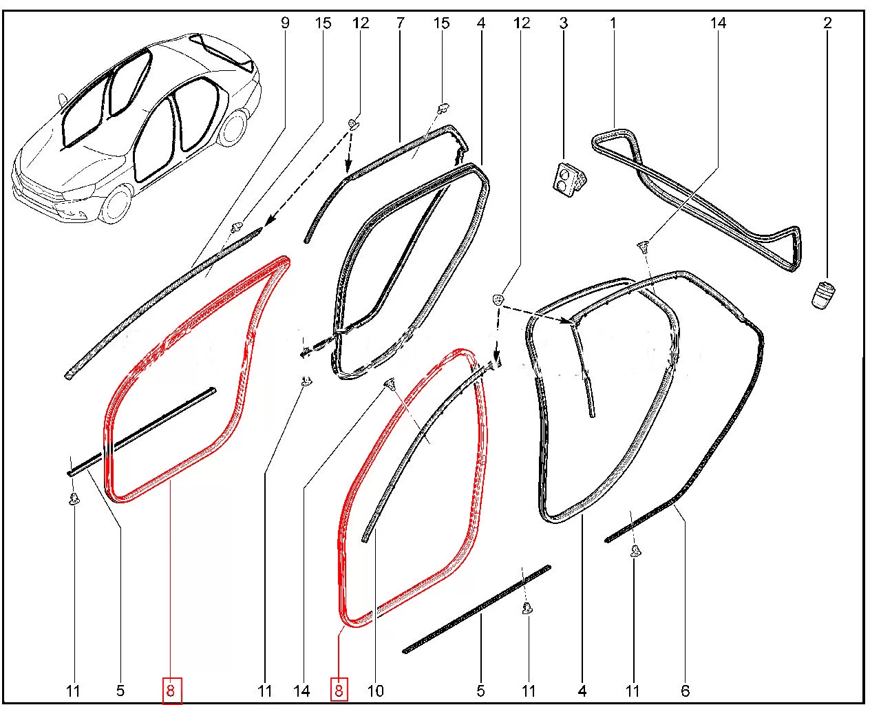 Уплотнитель проема передней двери (левый / правый) Лада Веста. На схеме №10 и 11.