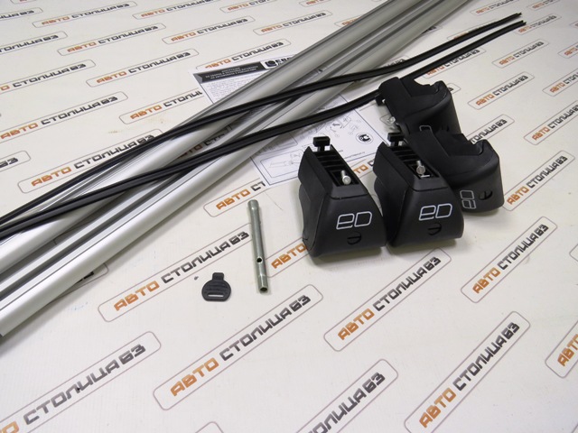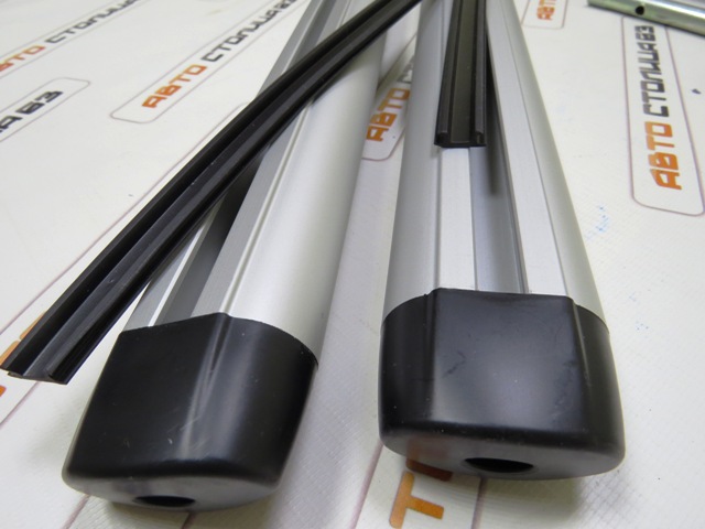 В комплект багажной системы входят 2 поперечины и четыре крепления на рейлинги. Поперечные дуги изготовлены из алюминия, имеют крыловидный профиль - специально разработанный для наиболее низкого сопротивления на скорости. Длина дуг - 1100 мм, сверху дуг проходит Т-профиль, предназначенный для установки дополнительного оборудования - велокреплений, лыжных насадок, фиксаторов груза и т.д. Концы дуг закрываются пластиковыми заглушками.