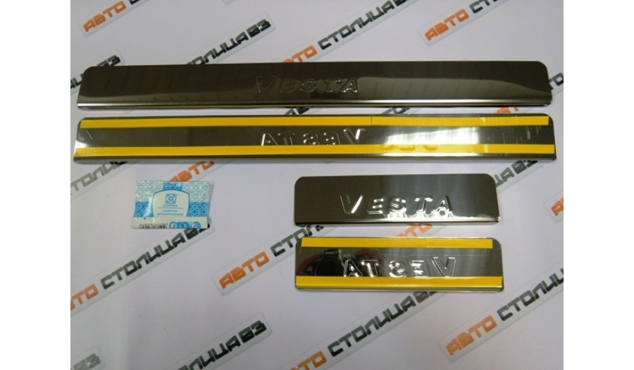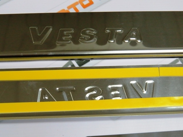 Накладки на пороги Лада Веста в кузове седан с тиснением "VESTA", комплект 4 шт, полированная нержавеющая сталь.
