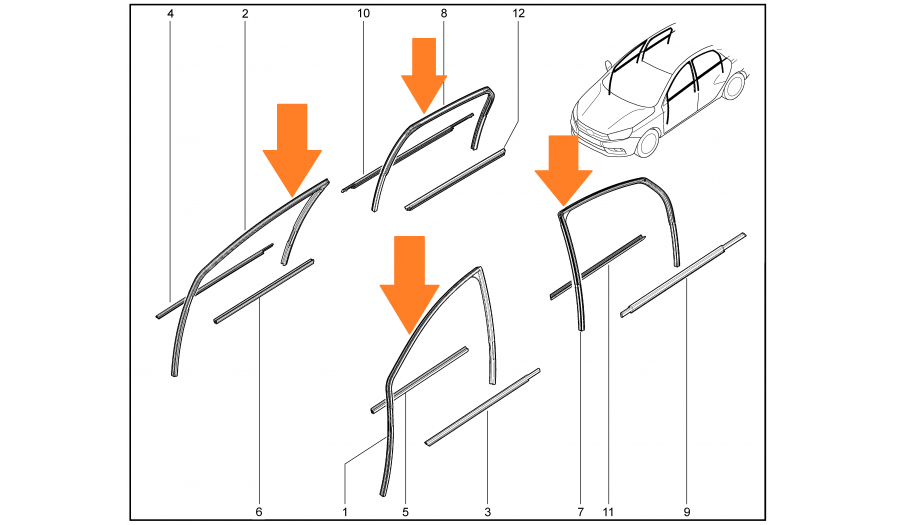 Комплект из 4 верхних уплотнителей стекол для Лада Веста в кузове Седан (на схеме обозначены стрелками, номера 1, 2, 7, 8).