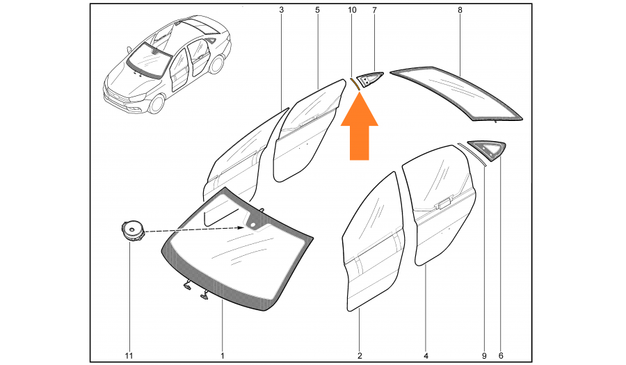 Штатный заводской молдинг стекла боковины правый для Лада Веста в кузове седан. На схеме изображен под номером 10.